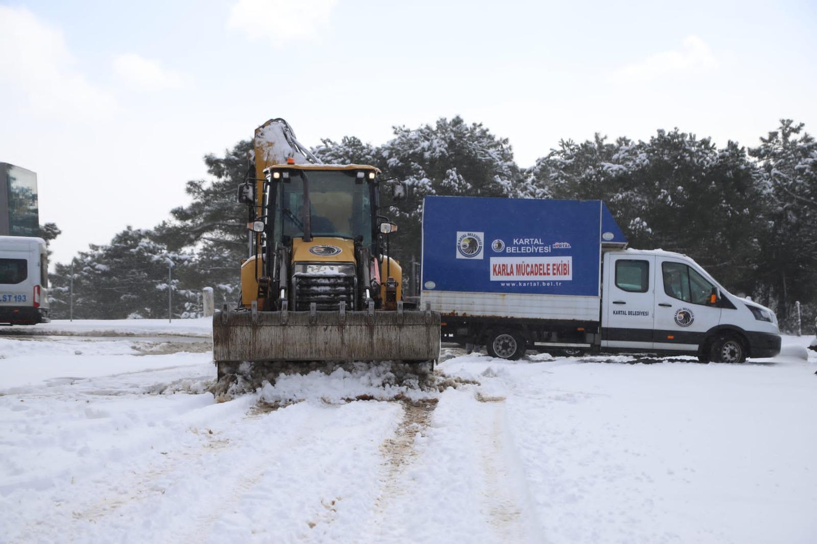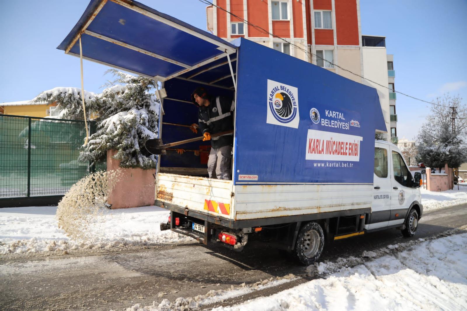 Kartal Belediyesi karla mücadele amacıyla 250 personel, 4 tuzlama aracı, 14 iş makinası,4 transit, 3 adet 4X4 pikap, 8 küreme aracı, 4 tuz nakil aracı, 9 saha sorumlusu ile ana arterler ve ara yollarda kar ve buzlanmaya karşı tuzlama ve temizlik çalışmaları yapıyor.