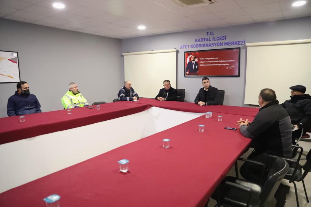 Kartal Belediye Başkanı Gökhan Yüksel de hem yoğun bir şekilde çalışan ekibine destek vermek hem de çalışmaları ve alınan önlemleri yerinde incelemek amacıyla ilçenin çeşitli mahallelerindeki karla mücadele noktalarını ziyaret etti. Burada ekiplerden çalışmalarla ilgili son durumu alan Başkan Gökhan Yüksel incelemelerinin ardından Kartal Belediyesi Afet Koordinasyon Merkezi’ne geçti. Merkezin salonunda; Kartal Belediyesi Başkan Yardımcıları ve birim müdürleriyle bir araya gelen Kartal Belediye Başkanı, burada da ‘Afet Koordinasyon’toplantısı gerçekleştirdi.