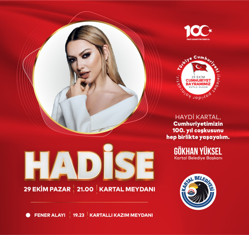Saatler 21.00’i gösterdiğinde ise Türk pop müziğinin sevilen ismi Hadise sahneye çıkacak. Sanatçı sevilen şarkılarını bu kez tüm Kartallılar ve Cumhuriyet’in 100. yılı için seslendirecek.