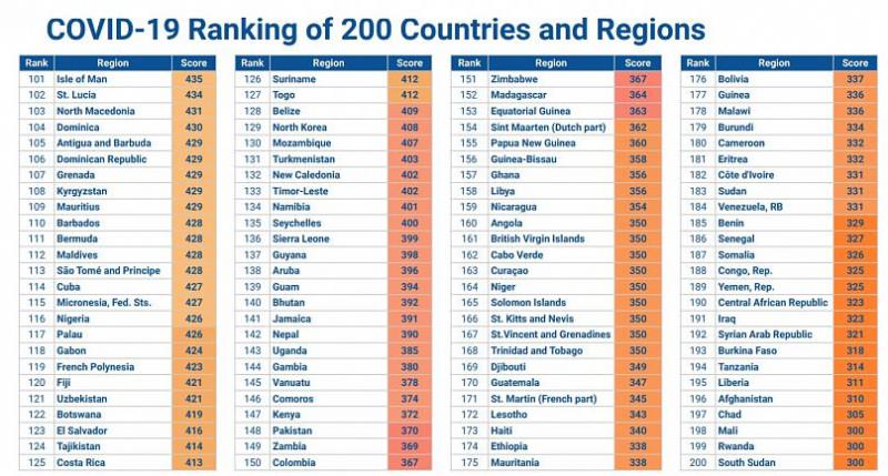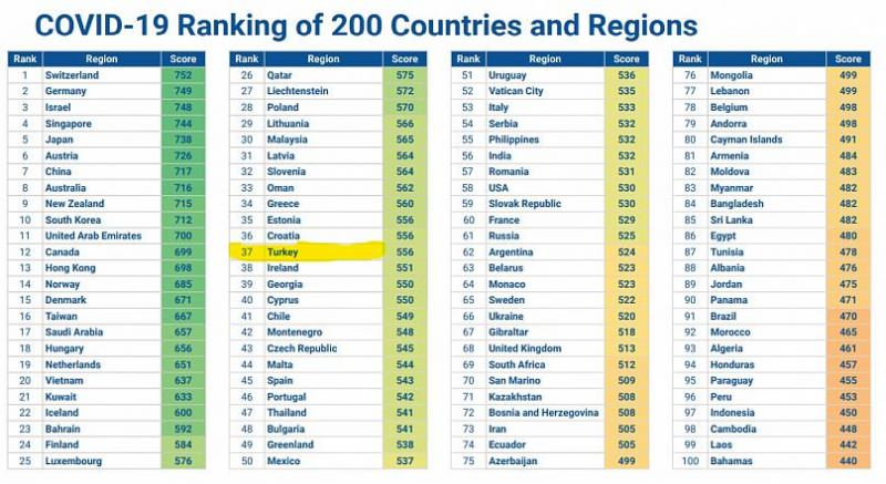 Araştırmaya göre Kovid-19 krizini küresel ölçekte en iyi İsviçre yönetiyor. İkinci sırada Almanya, üçüncü sırada İsrail geliyor. Araştırmada salgın döneminde en güvenli ülke sıralamasında 37. sırada yer alan Türkiye, Fransa, İtalya, İspanya ve İngiltere gibi baz Avrupa ülkelerinin önünde yer alırken, salgına karşı geç önlem almakla eleştirilen ABD 58’nci sırada yer aldı.