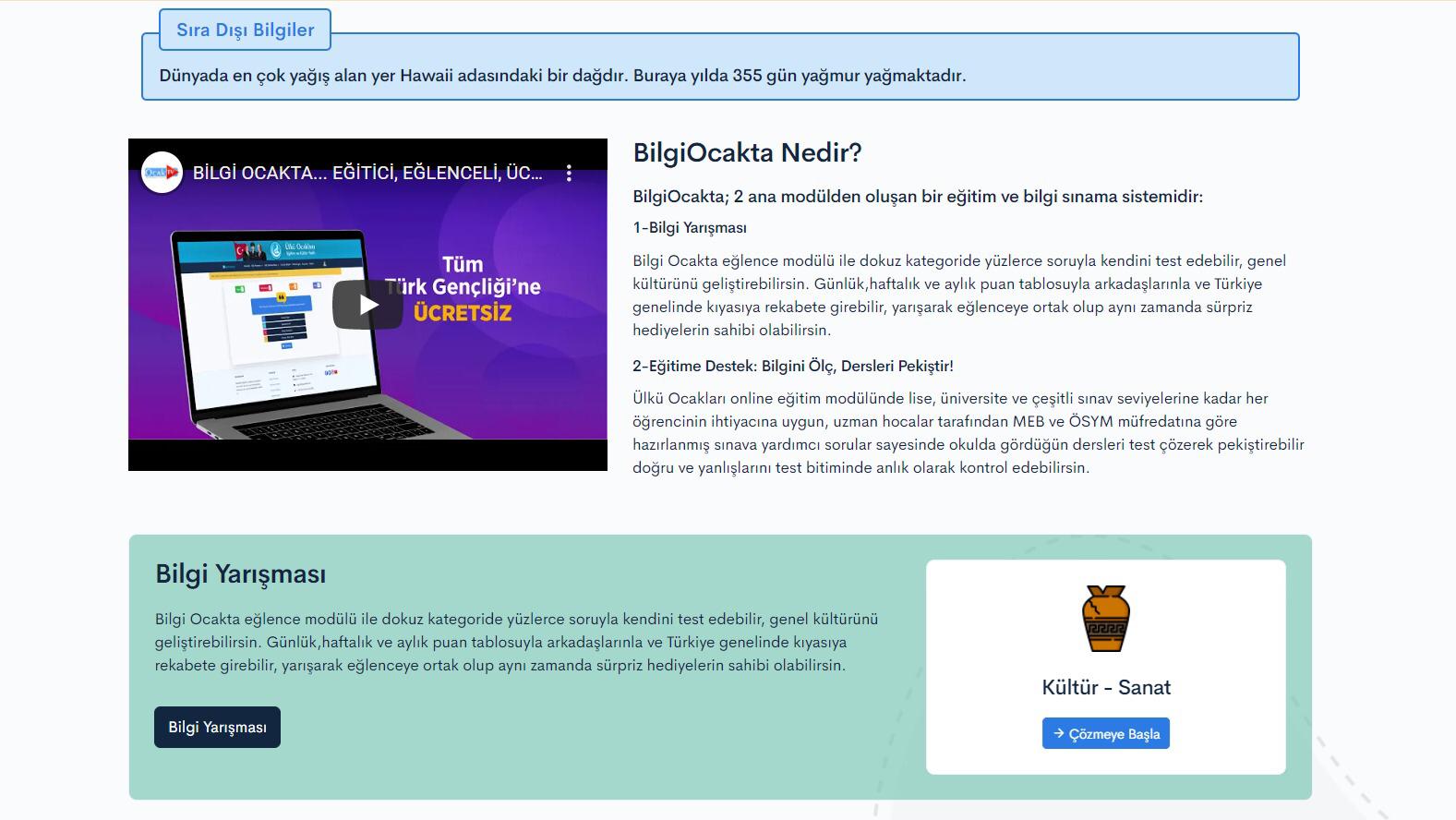 Okul çağındaki gençlerimizin derslerine yardımcı, her yaştan bireylerin aradığını bulabileceği, bilgi yarışmasından, test çözümlerine, sıra dışı bilgilerden, tarihte bugün neler olduğuna dair her türlü bilginin kaynağı bilgi ocakta da mevcuttur.