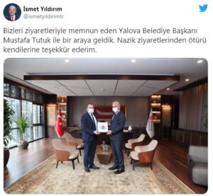 Başkan Yıldırım Başkan Mustafa Tutuk ’un ziyaretinden dolayı sosyal medya hesabında yaptığı paylaşımda; “Bizleri ziyaretleriyle memnun eden Yalova Belediye Başkanı Mustafa Tutuk ile bir araya geldik. Nazik ziyaretlerinden ötürü kendilerine teşekkür ederim.” İfadelerinde bulundu.