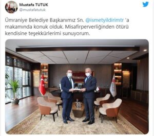 Yolova Belediye başkanı Mustafa Tutuk Ümraniye Belediye Başkanı İsmet Yıldırım’ ı ziyareti münasebetiyle sosyal medya hesabında yaptığı paylaşımda; “Ümraniye Belediye Başkanımız Sn. İsmet Yıldırım’ a makamında konuk olduk. Misafirperverliğinden ötürü kendisine teşekkürlerimi sunuyorum.” Dedi.