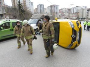 Ümraniye Armağanevler Mahallesi Harman Sokakta taksi ile otomobilin çarpışması sonucu meydana gelen kazada taksi yan yattı.